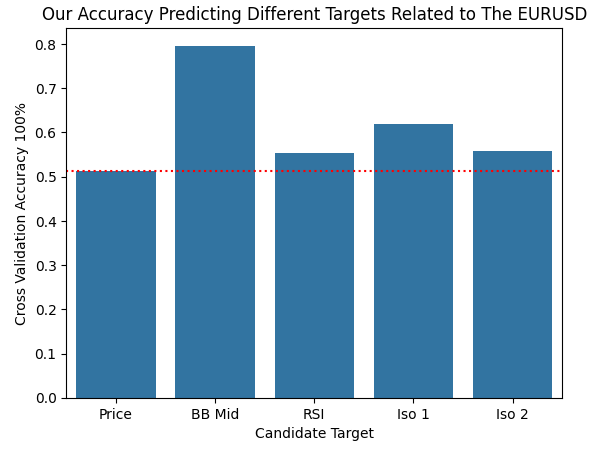 sns.barplot(scores) plt.xticks([0,1,2,3,4],['Price','BB Mid','RSI','Iso 1','Iso 2']) plt.axhline(scores[0],color='red',linestyle=':') plt.ylabel('Cross Validation Accuracy 100%') plt.xlabel('Candidate Target') plt.title('Our Accuracy Predicting Different Targets Related to The EURUSD')