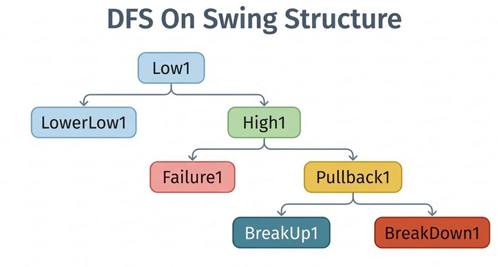 Within this framework, DFS allows the system to follow one structural branch deeply, such as a progression from a swing low to higher highs and higher lows, before considering alternative structural possibilities. The algorithm commits to this path as long as the structural conditions remain valid, measuring its strength through objective criteria such as path depth, key structural levels, and target tolerance. When the path breaks—such as when a critical swing level is invalidated—the algorithm deterministically backtracks to the previous node and explores other potential paths. By doing this, the sequence of price swings is treated as a traversable route through the market’s structure, transforming subjective price action analysis into a disciplined, codable process suitable for systematic and automated trading.