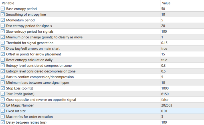 This implementation closes the gap between “seeing” entropy-driven patterns and “capturing” them consistently: it is auditable (logs and chart objects), testable (Strategy Tester-ready), and measurable (checks for MinSignalGap, reversal behavior, SL/TP application, and execution success via retries). Recommended next steps are systematic parameter optimization, cross-symbol/timeframe robustness testing, enhanced risk/money management, and integration into a portfolio-level execution framework. The EA provides a solid, verifiable foundation to iterate from information-theoretic insight to repeatable trading performance.