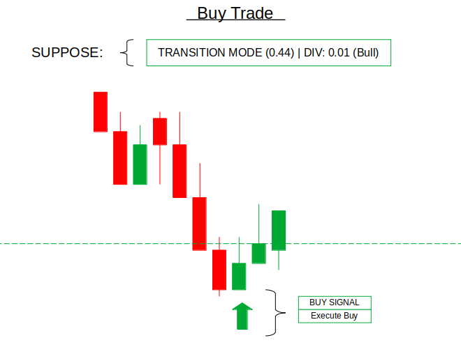 A buy signal typically occurs when fast entropy crosses above slow entropy, supported by positive momentum and entropy levels that indicate non-chaotic conditions. In addition, buy opportunities may arise from compression breakouts, where entropy transitions from a compressed state into decompression with strengthening momentum. These signals are further validated by divergence thresholds, regime classification, and compression state transitions to improve reliability. When confirmed, the EA executes a buy position and plots a green upward arrow below the corresponding candle.
