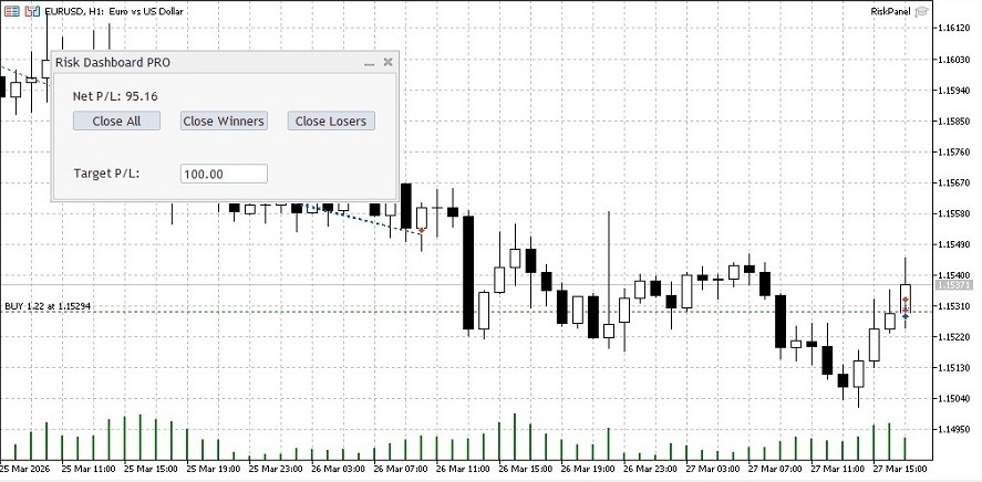 //+------------------------------------------------------------------+ //| Autonomously closes basket if floating reality exceeds target | //+------------------------------------------------------------------+ void CRiskPanel::CheckAutoTarget(double current_profit) { double target = StringToDouble(m_edit_target.Text()); // Trigger closure if target is valid and breached if(target > 0 && current_profit >= target) { PrintFormat("Auto-Target reached! Profit: %.2f >= Target: %.2f", current_profit, target); ExecuteBasketClose(0); // 0 = Close all filtered positions } } //--- Global Environment CRiskPanel ExtPanel; //+------------------------------------------------------------------+ //| Expert initialization function | //+------------------------------------------------------------------+ int OnInit() { // Instantiate the panel object if(!ExtPanel.Create(0,"Risk Dashboard PRO",0,50,50,410,210)) return(INIT_FAILED); ExtPanel.Run(); // Establish polling frequency EventSetTimer(1); return(INIT_SUCCEEDED); } //+------------------------------------------------------------------+ //| Expert deinitialization function | //+------------------------------------------------------------------+ void OnDeinit(const int reason) { // Destroy the panel and release resources ExtPanel.Destroy(reason); EventKillTimer(); } //+------------------------------------------------------------------+ //| ChartEvent function | //+------------------------------------------------------------------+ void OnChartEvent(const int id, const long &lparam, const double &dparam, const string &sparam) { // Route chart interactions to the panel event listener ExtPanel.ChartEvent(id,lparam,dparam,sparam); } //+------------------------------------------------------------------+ //| Timer function | //+------------------------------------------------------------------+ void OnTimer() { // Trigger the panel update sequence ExtPanel.UpdatePanel(); } //+------------------------------------------------------------------+ //| Expert tick function | //+------------------------------------------------------------------+ void OnTick() { // The panel is primarily event and timer driven. // OnTick is formally included to define the program as an Expert Advisor. }