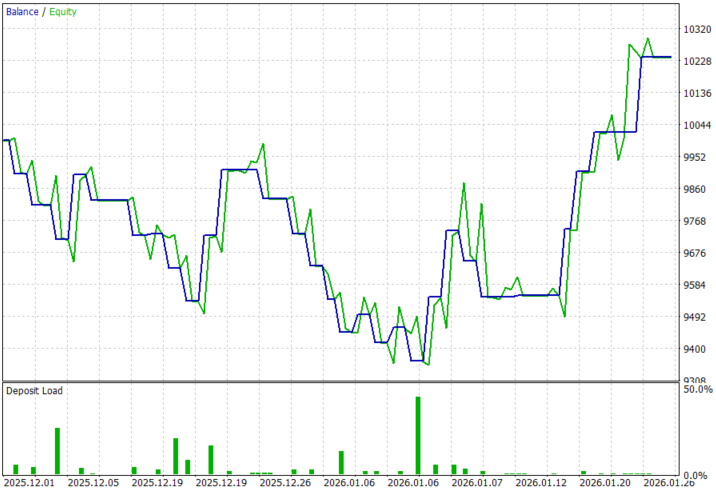 The backtest was conducted on the XAUUSD pair, on the H1 timeframe over a 2-month testing window (01 December 2025 to 30 January 2026), with the default settings:
