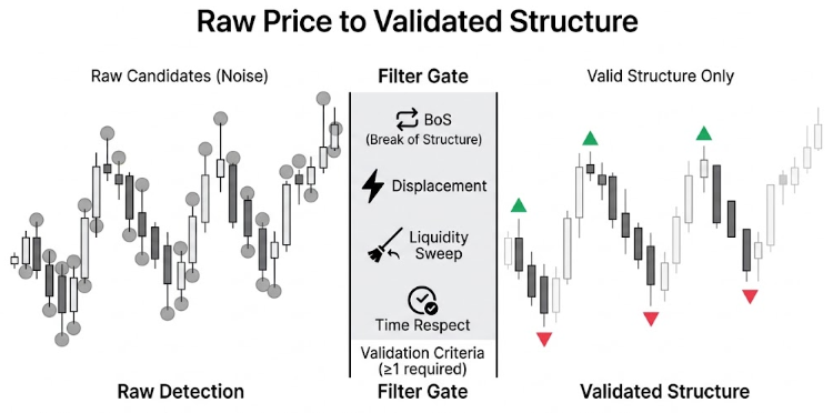 To solve this, we propose a multi-layered validation engine that moves beyond simple highs and lows by defining what makes a structure point valid. Instead of relying on raw swing points, the system uses a Structural Validation Engine. A swing is valid only if it shows a momentum-based Break of Structure (BoS), displacement via impulse candles, or results directly from a liquidity sweep. Combined with the Liquidity Interaction Layer and the State Machine, the algorithm distinguishes structural shifts from market noise. This methodology aligns entries with validated institutional zones rather than random price extremes. It targets liquidity pools while filtering out low-probability setups, resulting in a more robust, context-aware market structure.