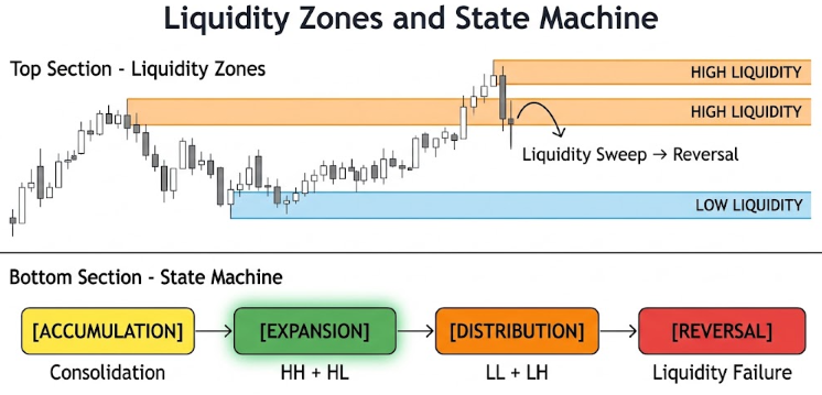 Liquidity zones mark where institutional orders reside, while the state machine continuously evaluates whether the market is accumulating, expanding, distributing, or reversing.