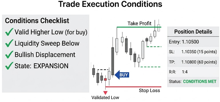 Entry requires confluence of validated structure, liquidity interaction, and market state alignment. Stop losses anchor to validated structure, not raw swings, with take profits targeting a defined Risk:Reward ratio.