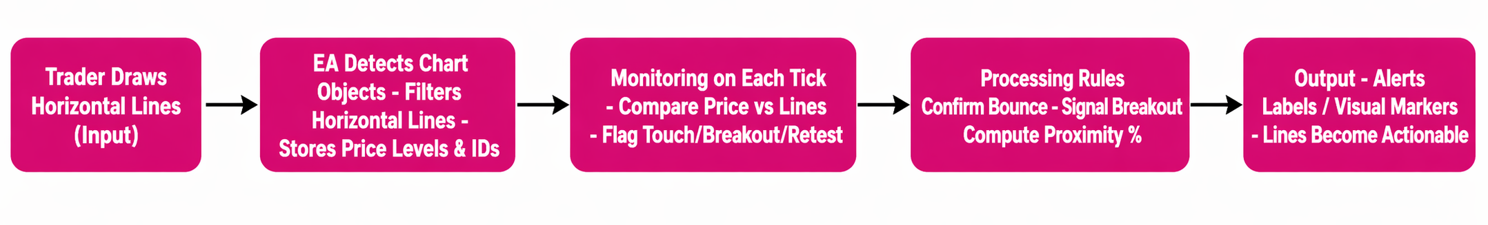 - Monitoring: On each new tick, price is compared against every line. Relevant conditions (touch, breakout, or retest) are flagged.