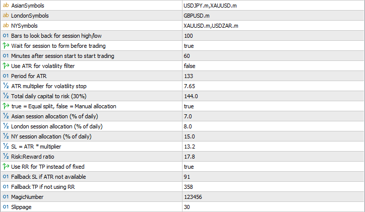 //+------------------------------------------------------------------+ //| Enumerations and structures | //+------------------------------------------------------------------+ enum SessionType { SESSION_ASIAN, SESSION_LONDON, SESSION_NEWYORK, SESSION_OFF }; struct SymbolData { string name; double sessionHigh; double sessionLow; double upperVolatilityStop; double lowerVolatilityStop; bool highBreakoutTriggered; bool lowBreakoutTriggered; datetime sessionStartTime; datetime lastTradeTime; double currentATR; }; struct SessionInfo { SessionType type; double allocationPercent; double usedRisk; double maxRisk; string activeSymbols; datetime startTime; datetime endTime; bool isActive; }; //+------------------------------------------------------------------+ //| Global variables | //+------------------------------------------------------------------+ int m_numSymbols; SymbolData m_symbols[]; SessionInfo m_currentSession; SessionInfo m_asianSession; SessionInfo m_londonSession; SessionInfo m_nySession; datetime m_lastBarTime; SessionType m_previousSession; double m_dailyRiskUsed; double m_dailyMaxRisk; datetime m_lastResetDate; int m_atrHandle[]; bool m_dailyResetPrinted; double m_dailyNetProfit; datetime m_lastProfitUpdate; bool m_allocationValid;
