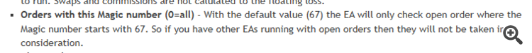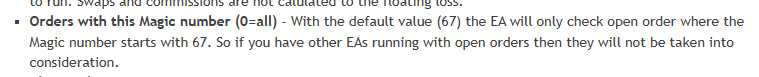 - Orders with this Magic number (0=all) - With the default value (67) the EA will only check open order where the Magic number starts with 67. So if you have other EAs running with open orders then they will not be taken into consideration.