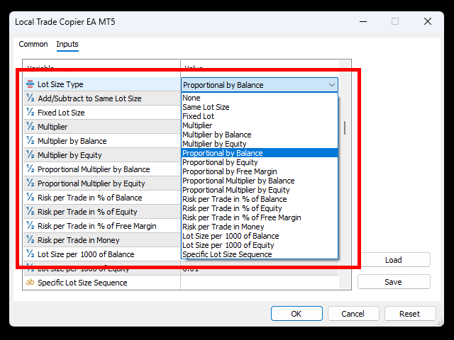 16.ロットサイズ管理セクションで、コピーした取引をレシーバーアカウントにコピーする方法を選択します。