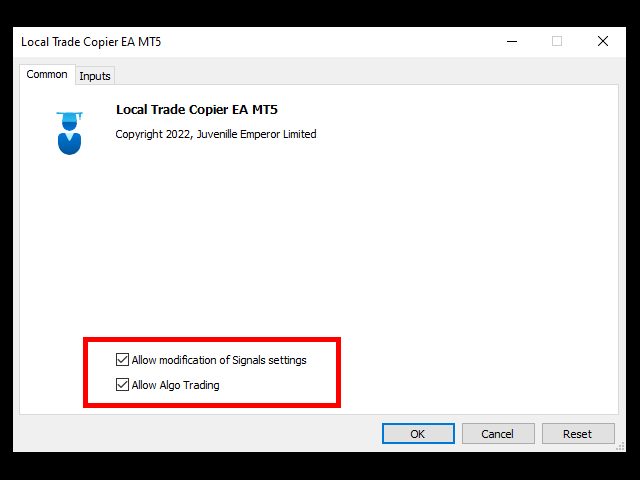 13. ExpertAdvisorの設定ウィンドウが開きます。 MT4ターミナルで、[Common]タブの[Allow live Trading]オプションと[Allowmodification of Signals]設定をクリックし、[OK]をクリックします。 MT5ターミナルで、[シグナルの変更を許可する]設定と[アルゴリズム取引を許可する]オプションにチェックマークを付け、[OK]をクリックします。