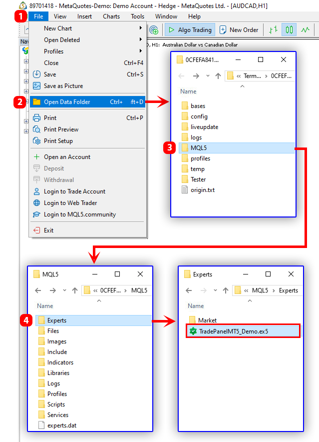 Open the MetaTrader 4 or 5 platform and go to the "Experts" folder: