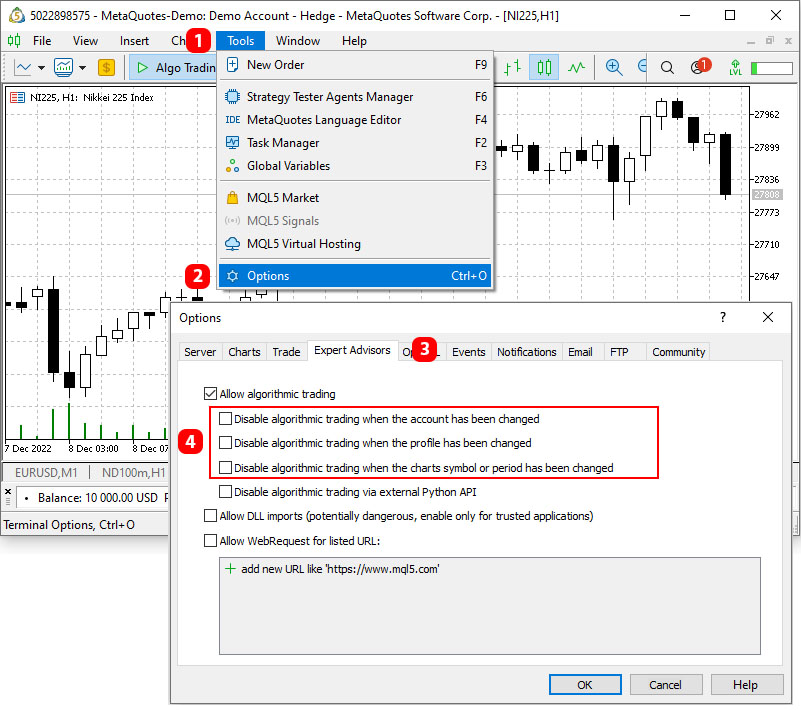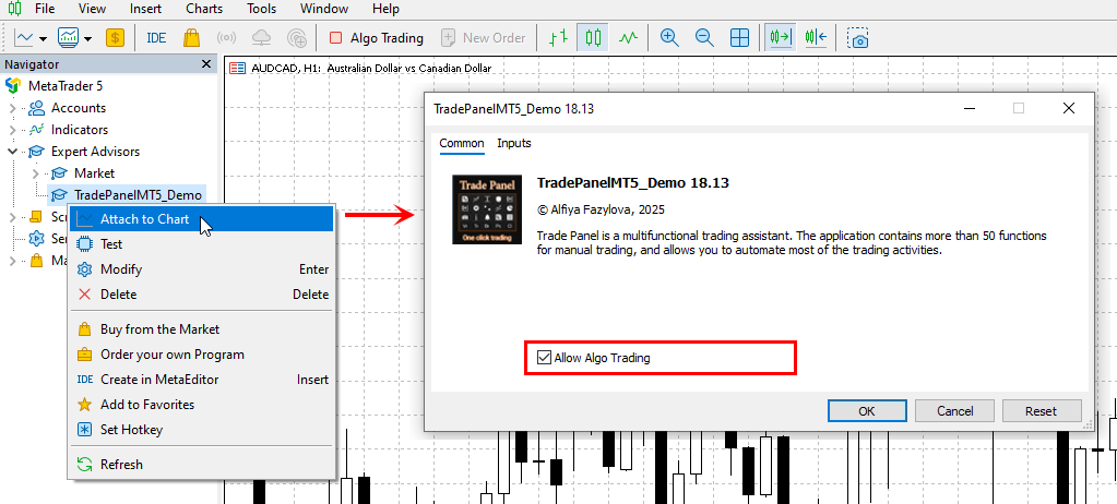 In the "Navigator" window, find the "TradePanelMT5_Demo" file, right-click it, and select "Attach to Chart" from the context menu, or simply drag the file onto the chart. In the window that opens, go to the "Common" tab and check the "Allow live trading" box for MT4, or "Allow Algo Trading" for MT5.