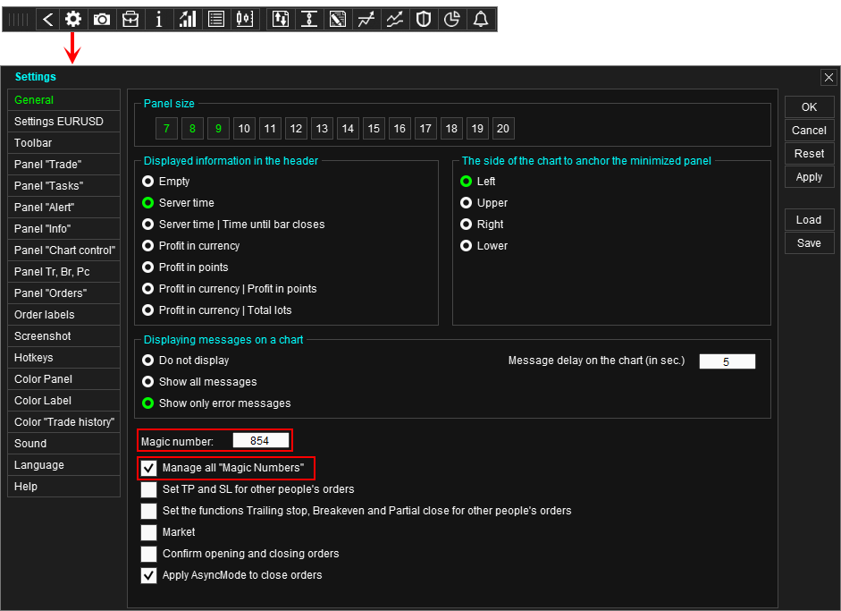 - The "Manage all Magic Numbers" checkbox must be unchecked for each TradePanel (the "Manage all Magic Numbers" checkbox can only be enabled if there is only one instance of TradePanel running on the terminal).