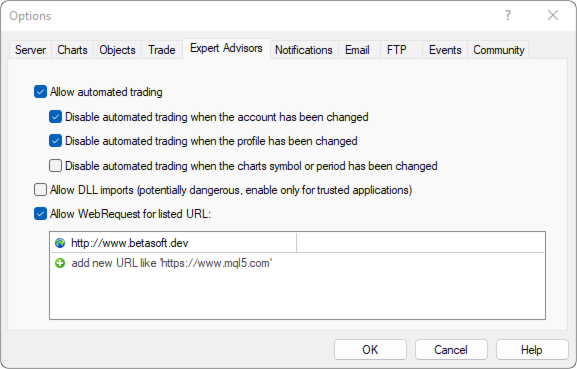 Here are the steps to add a link to the allowed URLs list in MetaTrader (Check The Image Below):
