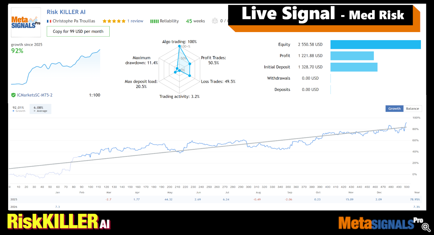 RiskKILLER AI, is our new EA project with Multi Assets Risk diversified, Bitcoin boosted and AI assisted Risk management.