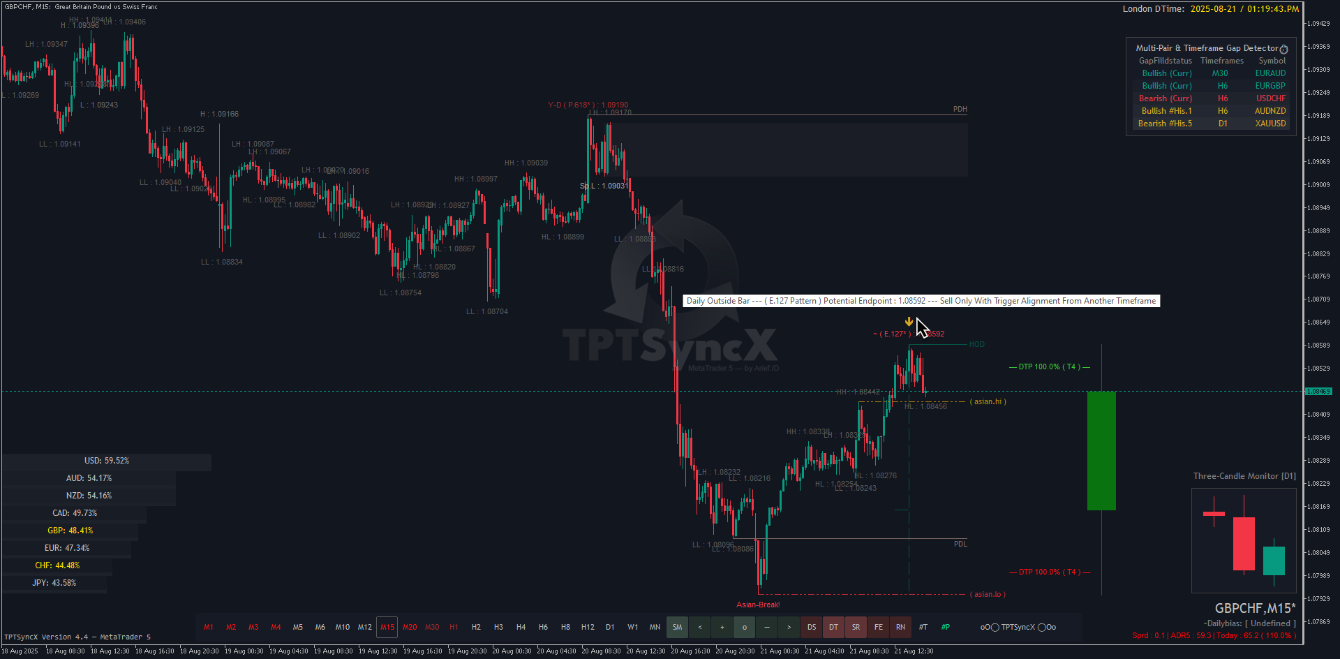 A specialized tool that scans for price gaps in the current time, across multiple pairs and multiple timeframes simultaneously. It automatically highlights imbalance zones where liquidity was skipped, giving traders clear references for potential retracements or continuations. GDT is also presented in the form of a dashboard on the current chart, allowing instant monitoring and comparison without switching symbols or timeframes, making it highly efficient for both intraday and swing strategies.
