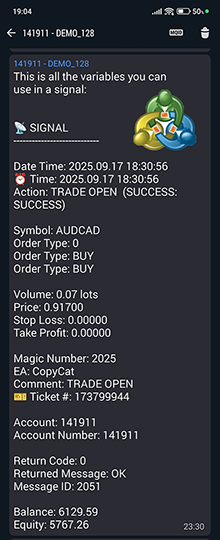 Copy Cat Module is a companion utility for Copy Cat More Trade Copier MT5 and MT4. It works on the Slave terminal and broadcasts every trade event to Telegram and/or MetaTrader mobile push notifications. With message templates and language files, you can customize alerts for personal use, team sharing, or signal broadcasting.