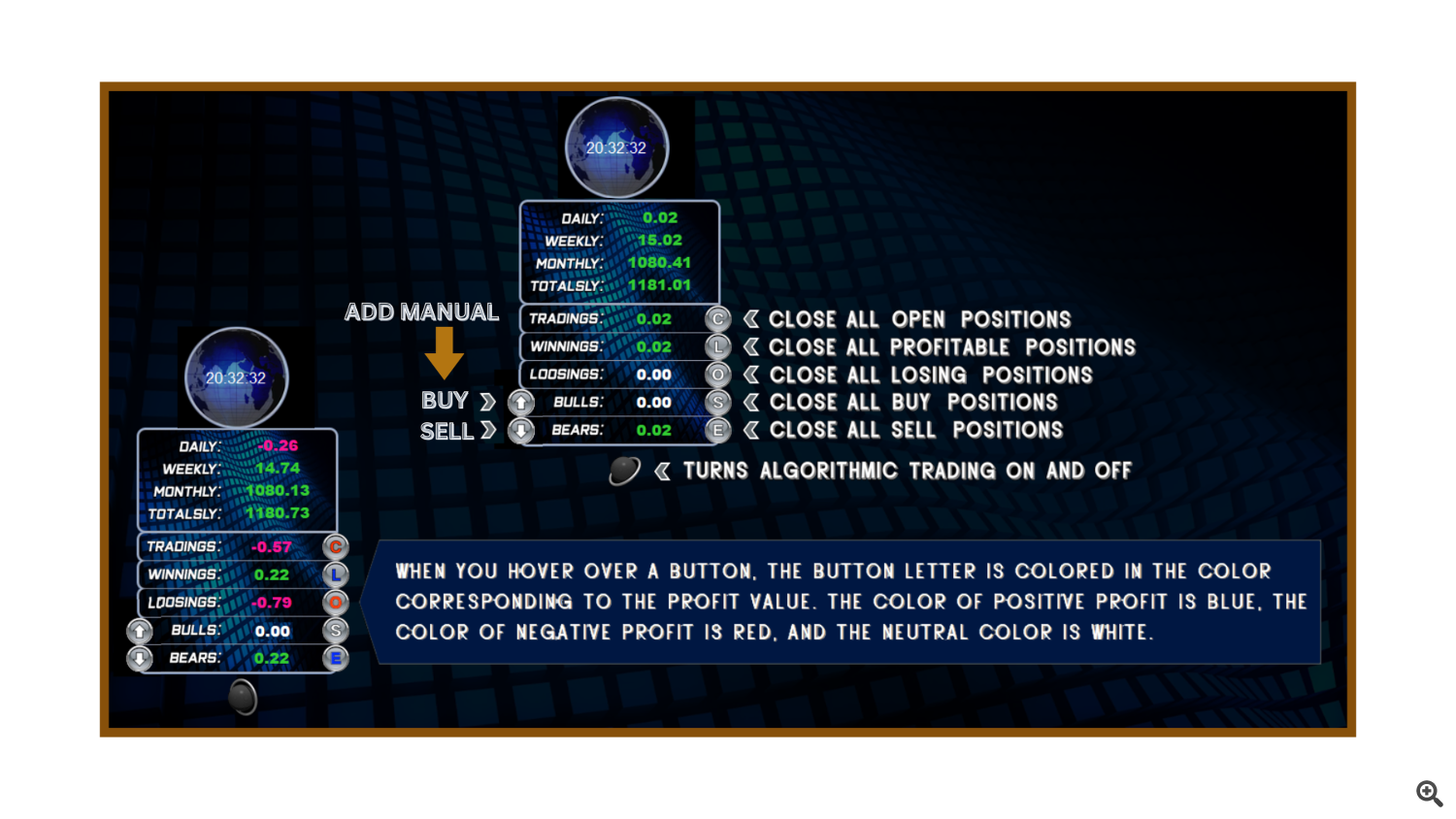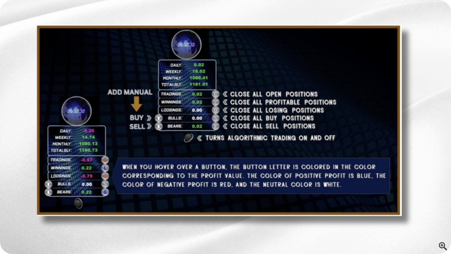 When you hover your mouse over a button, its color changes based on your results — blue for profit, red for loss, and white for neutral.