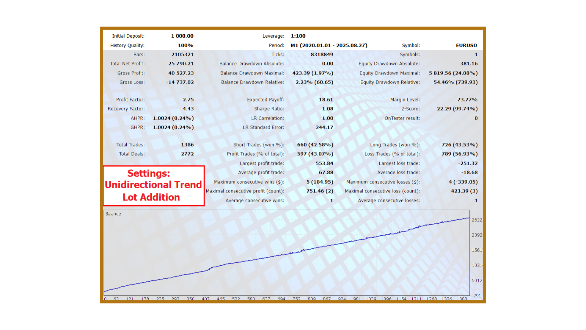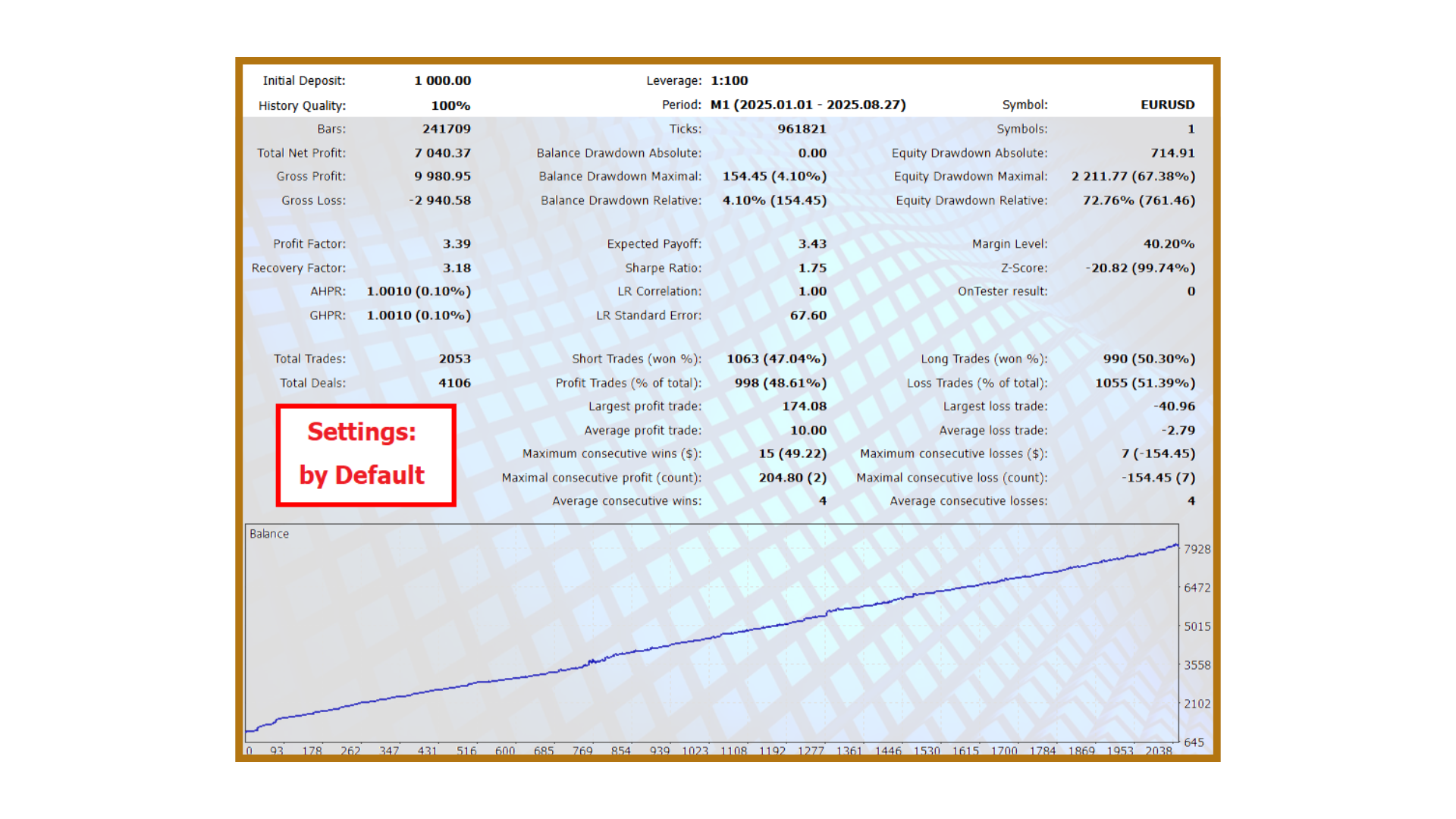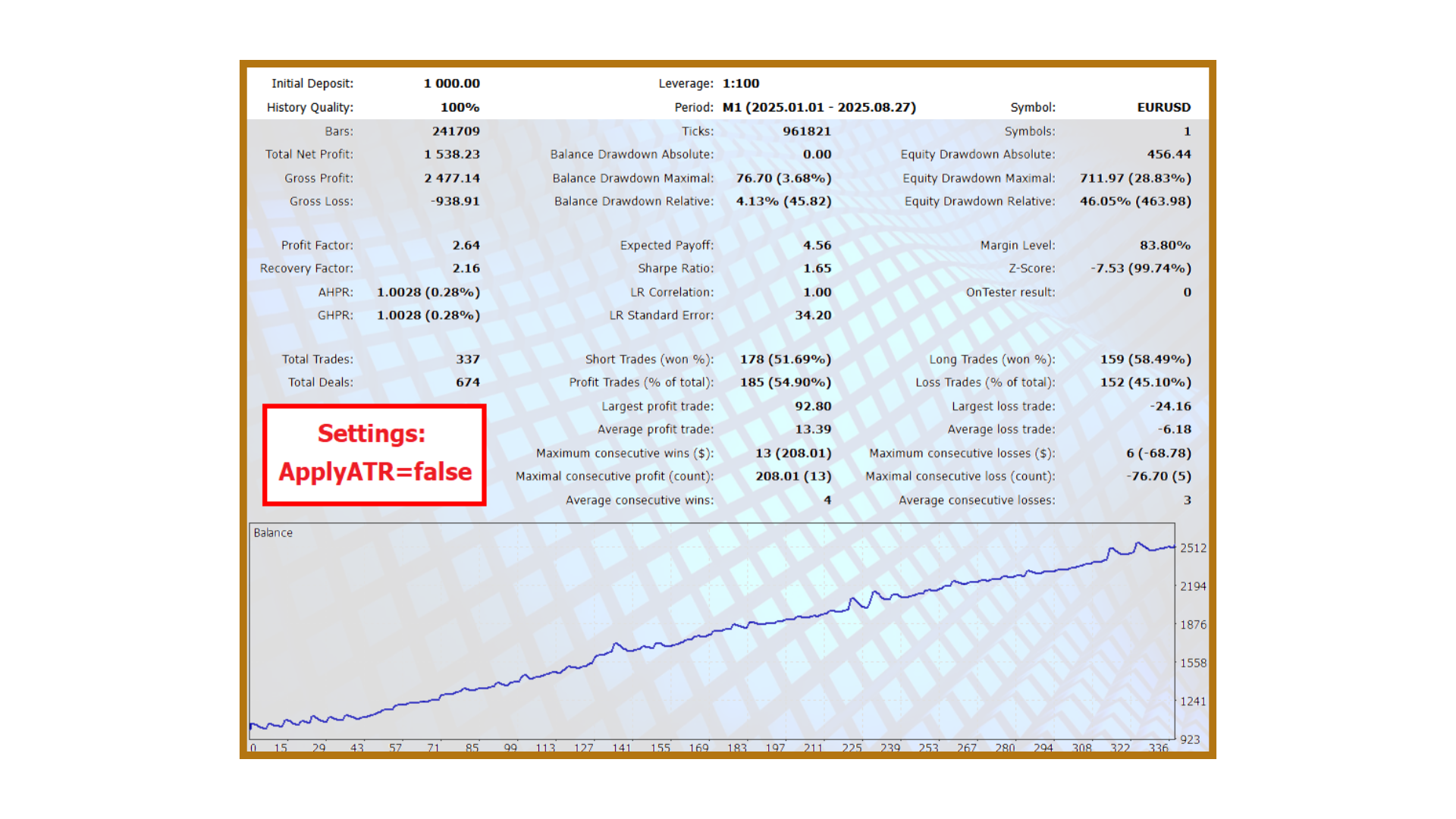 The following backtests demonstrate how the EA behaves under different configurations and market conditions. Each one was performed using high-quality tick data and realistic spreads.