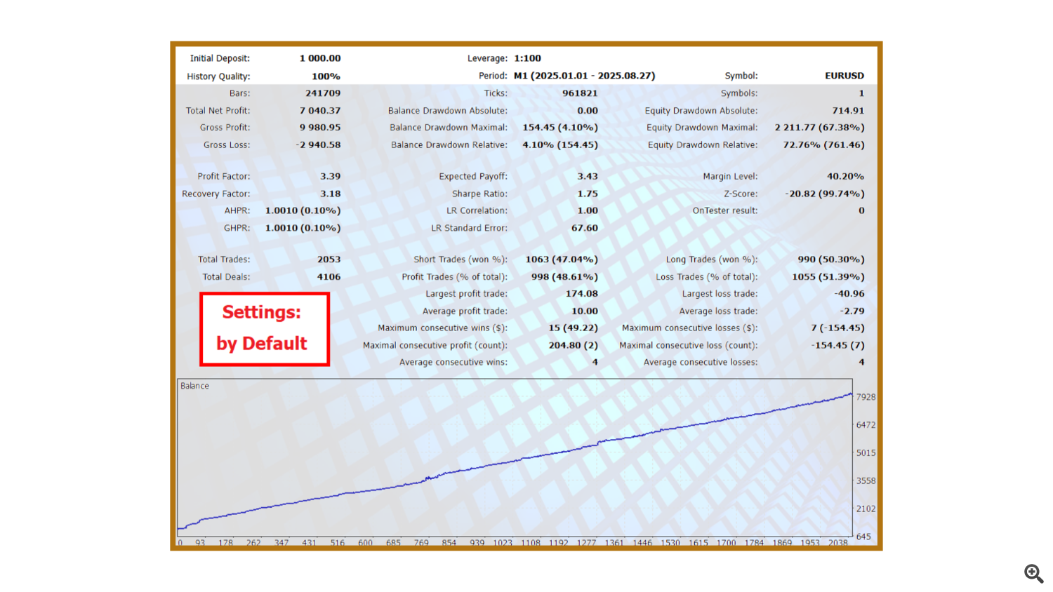 This preset includes all optimized parameters used for EURUSD M1–M5 backtests with realistic spreads, matching the charts you’ve seen above.