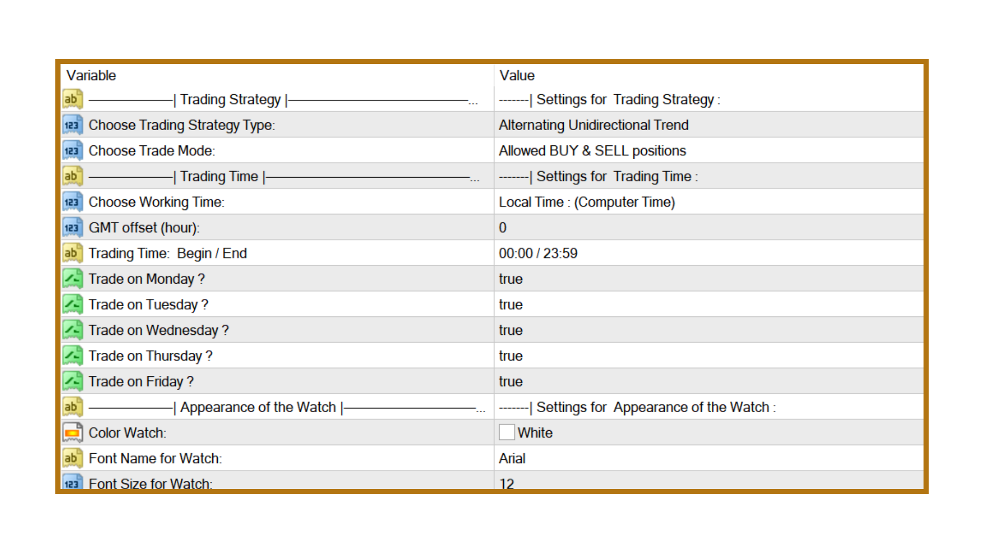 Working Time / Trading Days – Define when the EA is allowed to trade. You can limit trading to certain days or specific hours (useful to avoid high volatility periods).