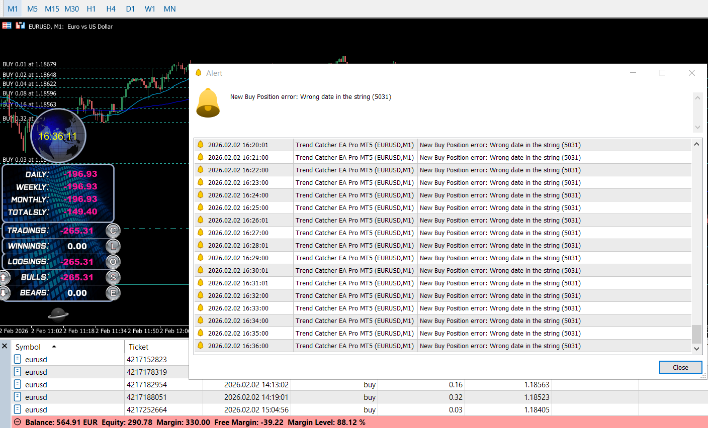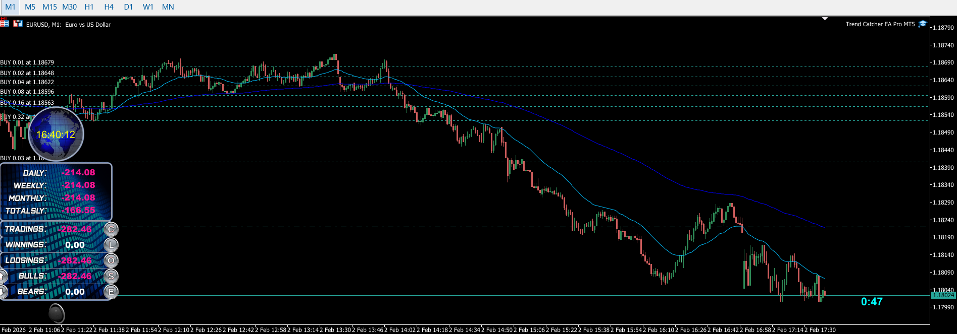 Attach the EA to your chosen chart — EURUSD M1 or M5 are the most tested and recommended pairs/timeframes. Once attached, you’ll instantly see the floating dashboard and active timer at the top.