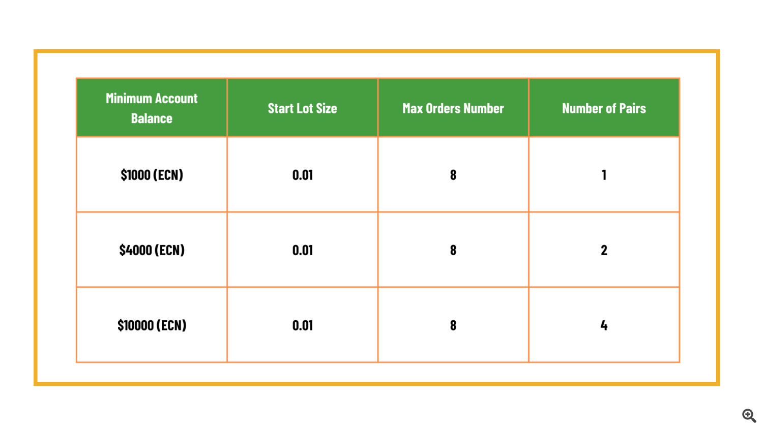 | Min Deposit | $1 000 (ECN) | Minimum recommended capital for 1 pair |