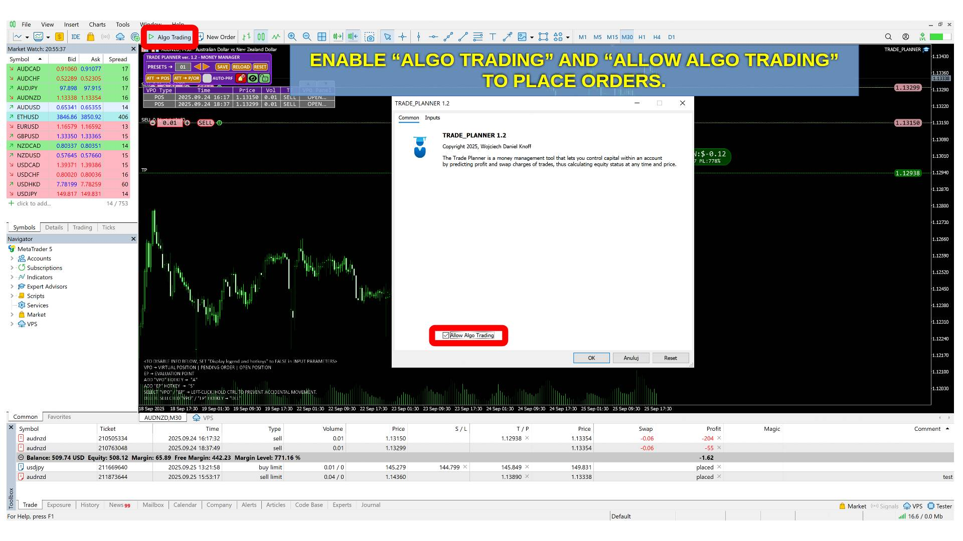 The program functions as an Expert Advisor, allowing it to place pending orders and manage open trades. To enable order management, both “Algo Trading” and “Allow Algo Trading” must be switched on.