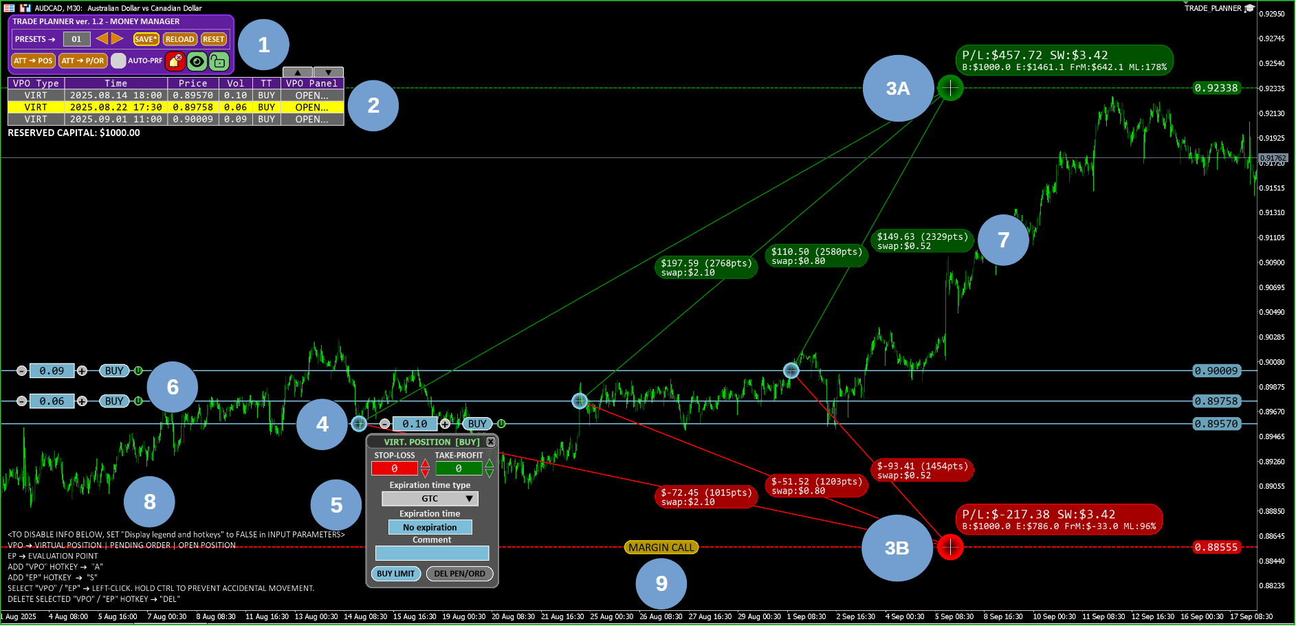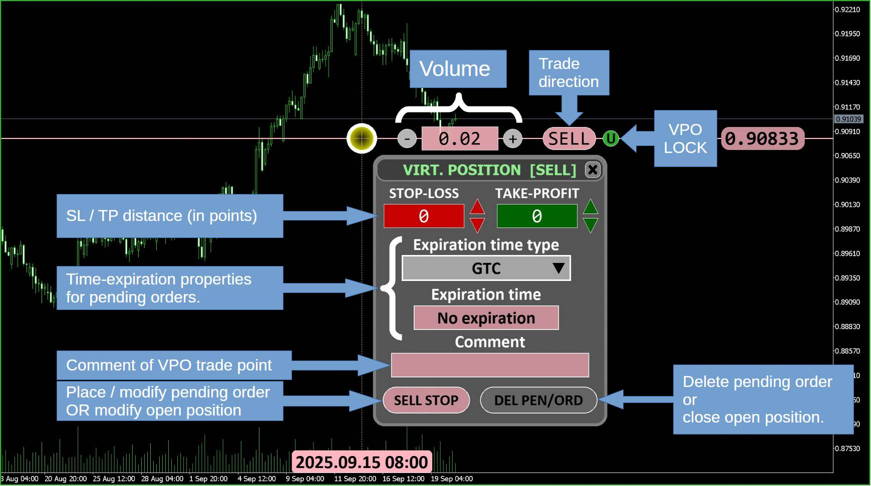 By default, a newly created VPO functions as a harmless virtual position trade point. It does not expose your real account to any risk, yet it has all the necessary properties to plan and prepare trades effectively, such as placing pending orders.