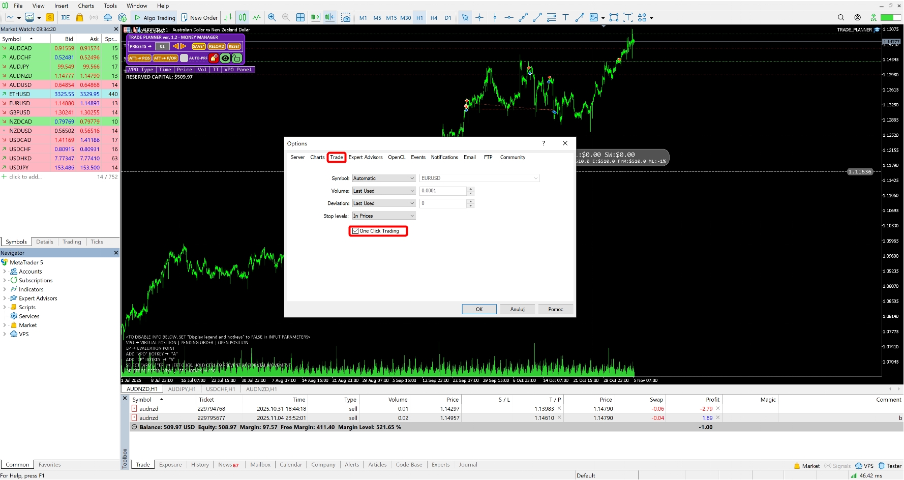 Also, check that One-Click Trading is enabled in the terminal options under the “Trade” tab.