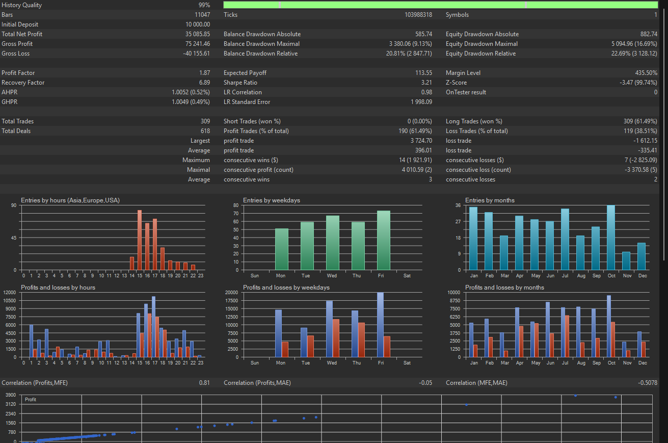 For example, if you want to keep your drawdown below 15%, the table suggests using around 0.73% risk per trade, and setting Max Monthly Symbol Relative DD (%) = 15. Conservative traders can focus on the 10% range, while aggressive traders may use the 25–30% range.