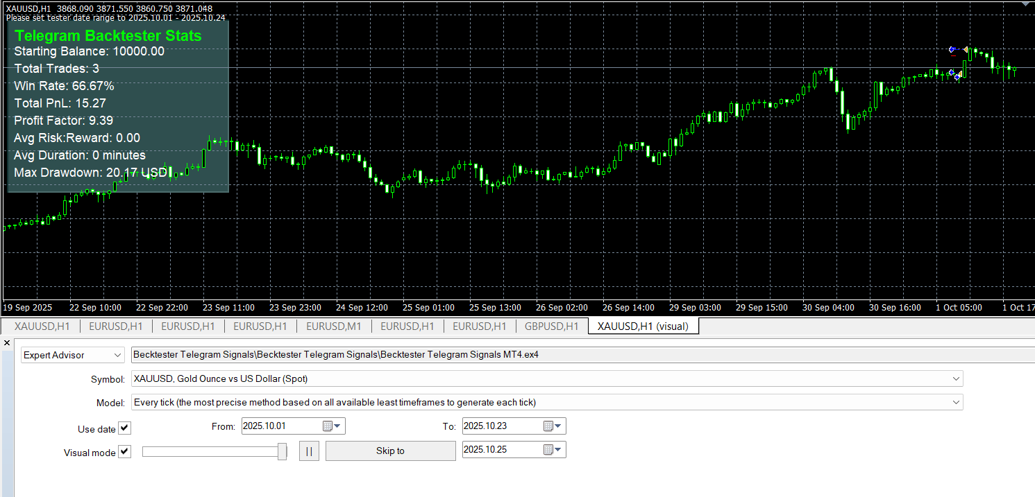 - Backtesting in MetaTrader — EA automatically reproduces trades and generates a report.