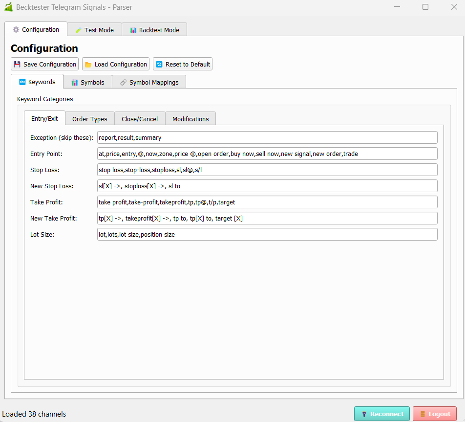 - Parsing — the tool reads messages and extracts signals with Entry, SL, TP levels.