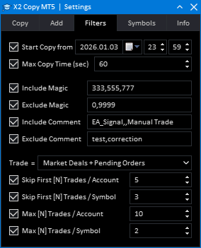 Skip First [N] Trades / Account — A permanent rule to ignore the first N trades on the entire MASTER account. The program will NEVER copy the first N trades (taking into account the "Trade Type for Counters" setting), but will start copying from the trade number N+1 and all subsequent ones. Example: a value of 5 means that the first 5 trades on the account will be ignored, and copying will start from the 6th trade.