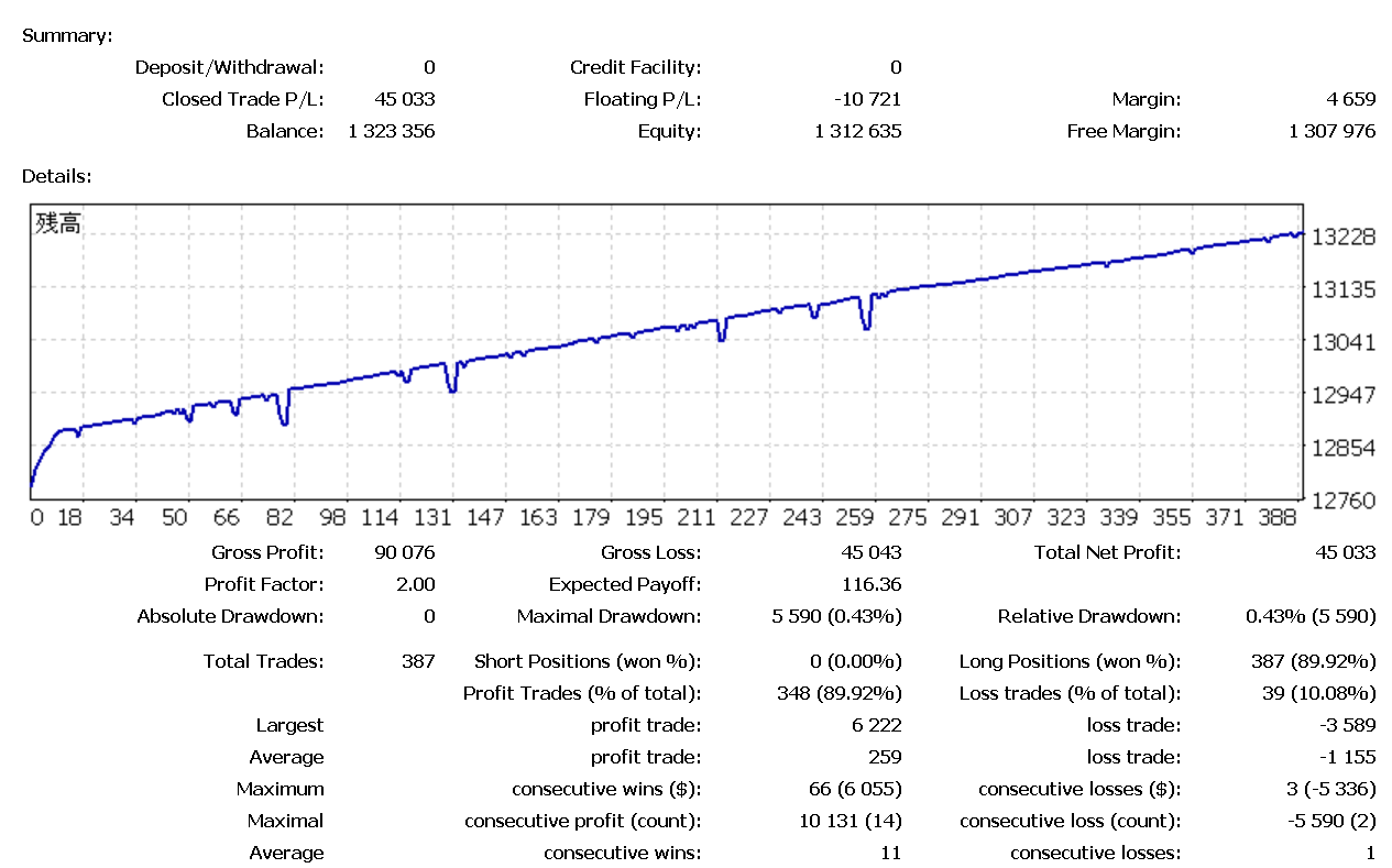 Maximal drawdown: 0.43% (about 5,590 in account currency)