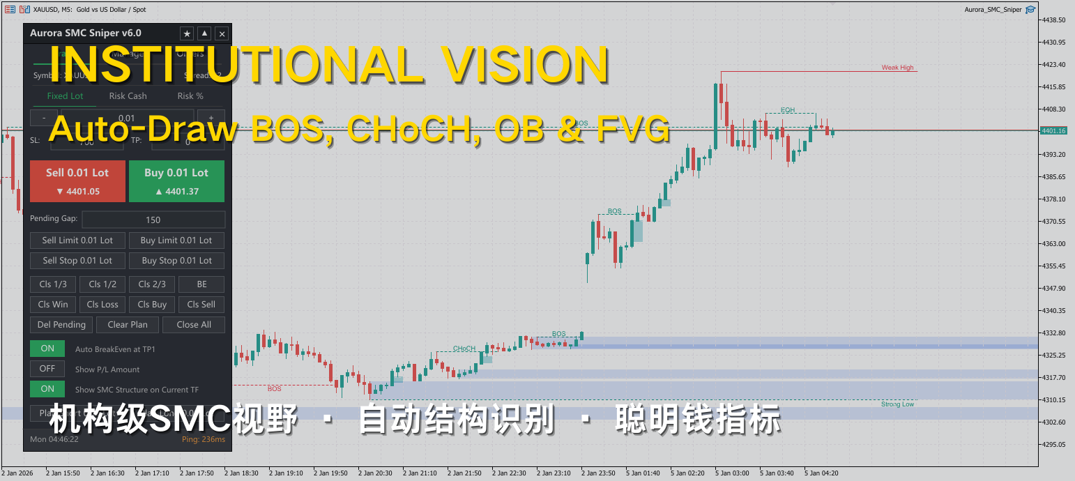 ✅ The Solution: Institutional Vision Why draw lines manually? I integrated an SMC Engine into the panel. It automatically highlights High probability Order Blocks, FVGs, and Structure Breaks in real-time. It keeps my charts clean and my focus sharp.