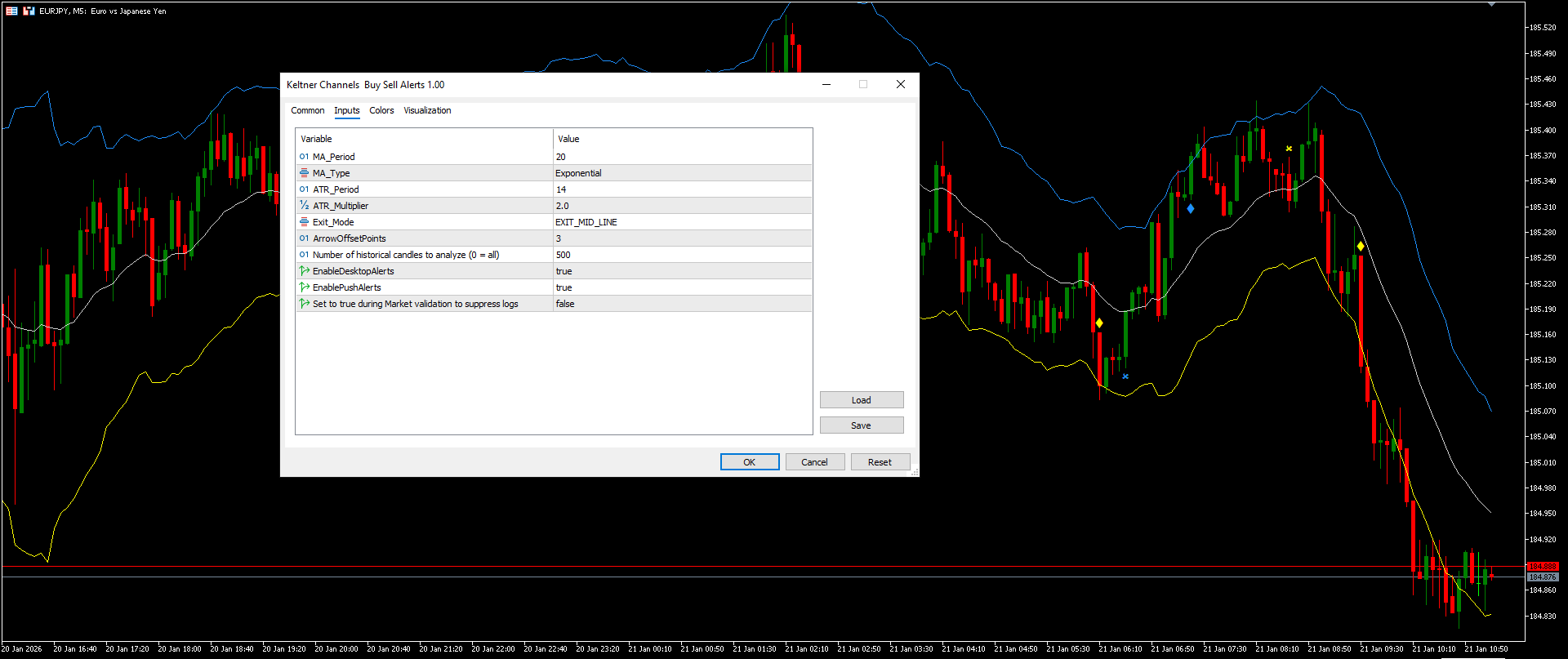 - Exit_Mode (default EXIT_OPPOSITE_BAND): Choose how positions close. Options include closing on opposite band cross, mid-line cross, or return inside the channel.