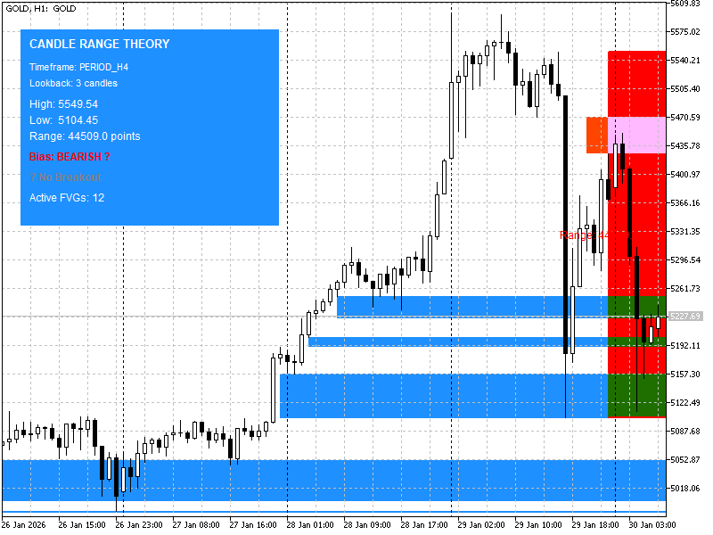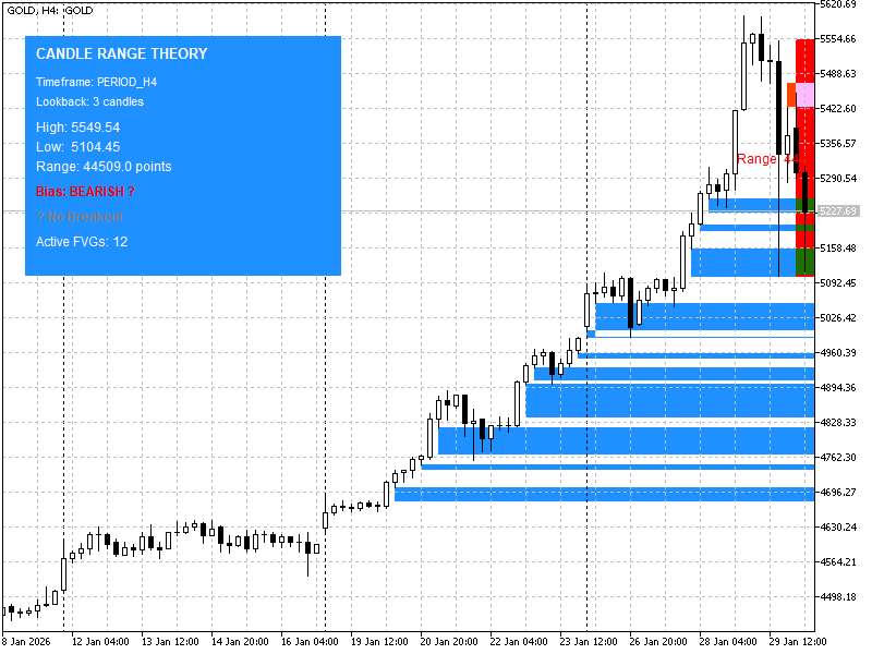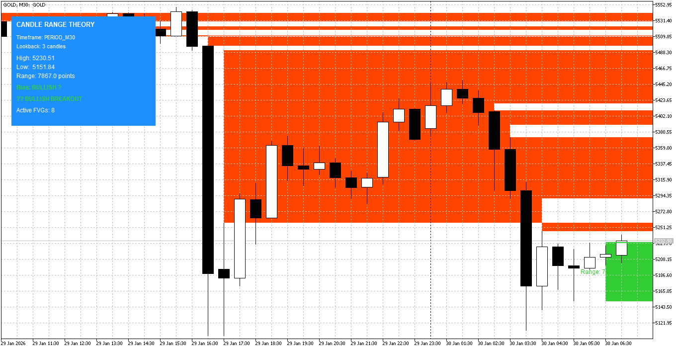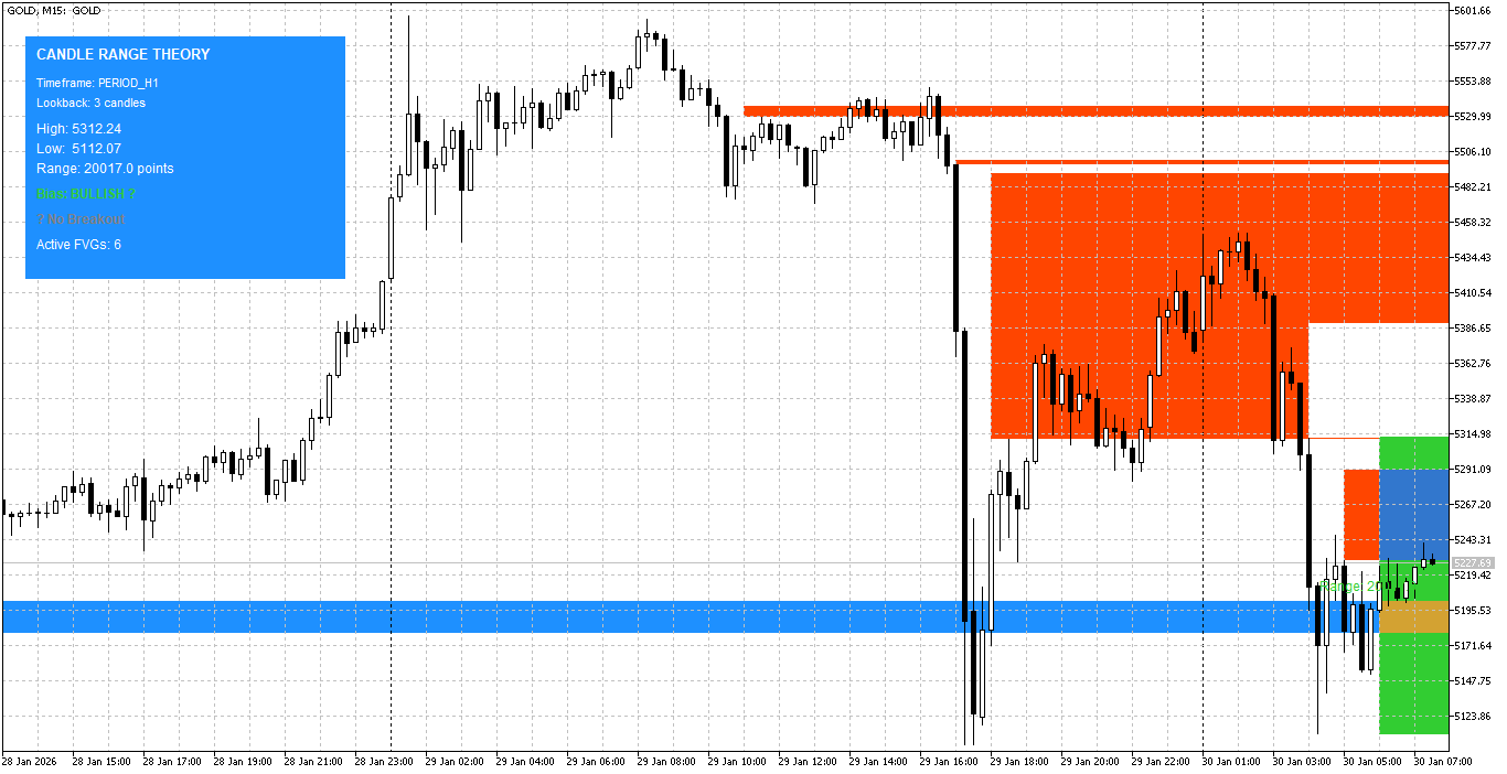 This is where things get really interesting. The indicator doesn't just show ranges - it also identifies Fair Value Gaps (FVGs), those inefficient price zones that institutional traders love to target. It tracks up to 200 FVGs, marks them on your chart, and even hides filled gaps automatically to keep your workspace clean.
