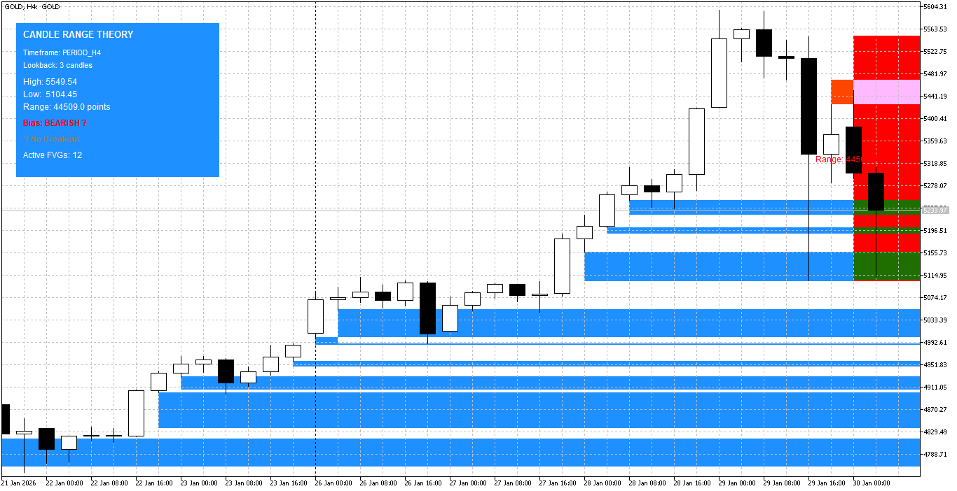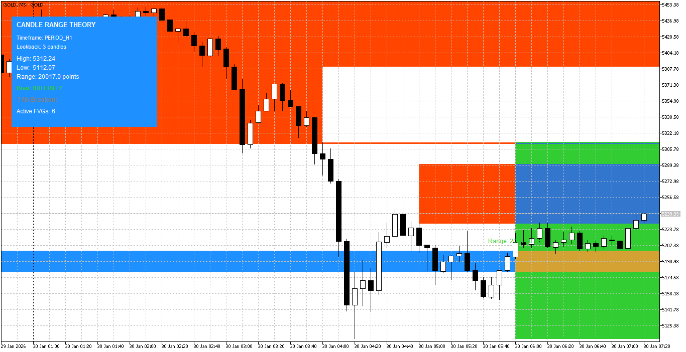 Your chart won't look like a mess of lines and boxes. Everything is color-coded: bullish ranges in green, bearish in red, FVGs in blue and orange. Historical ranges fade into the background so you can focus on current opportunities.