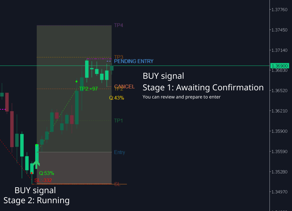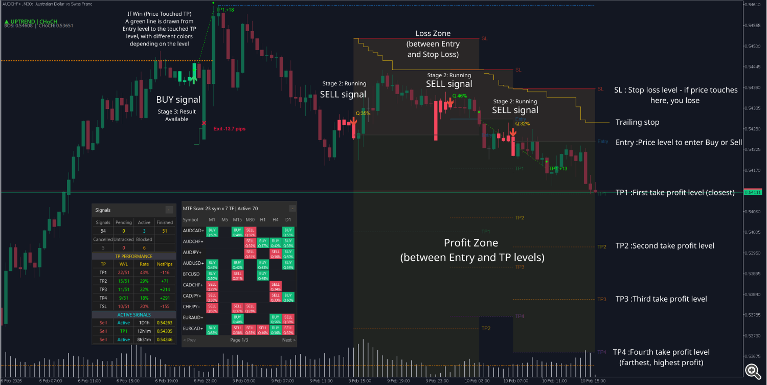 Line Color What does it mean? Entry Blue Price level to enter Buy or Sell Stop Loss Red Stop loss level - if price touches here, you lose TP1 Green First take profit level (closest) TP2 Yellow Second take profit level TP3 Orange Third take profit level TP4 Purple Fourth take profit level (farthest, highest profit) Completed Gray Signal is finished (touched TP or SL)