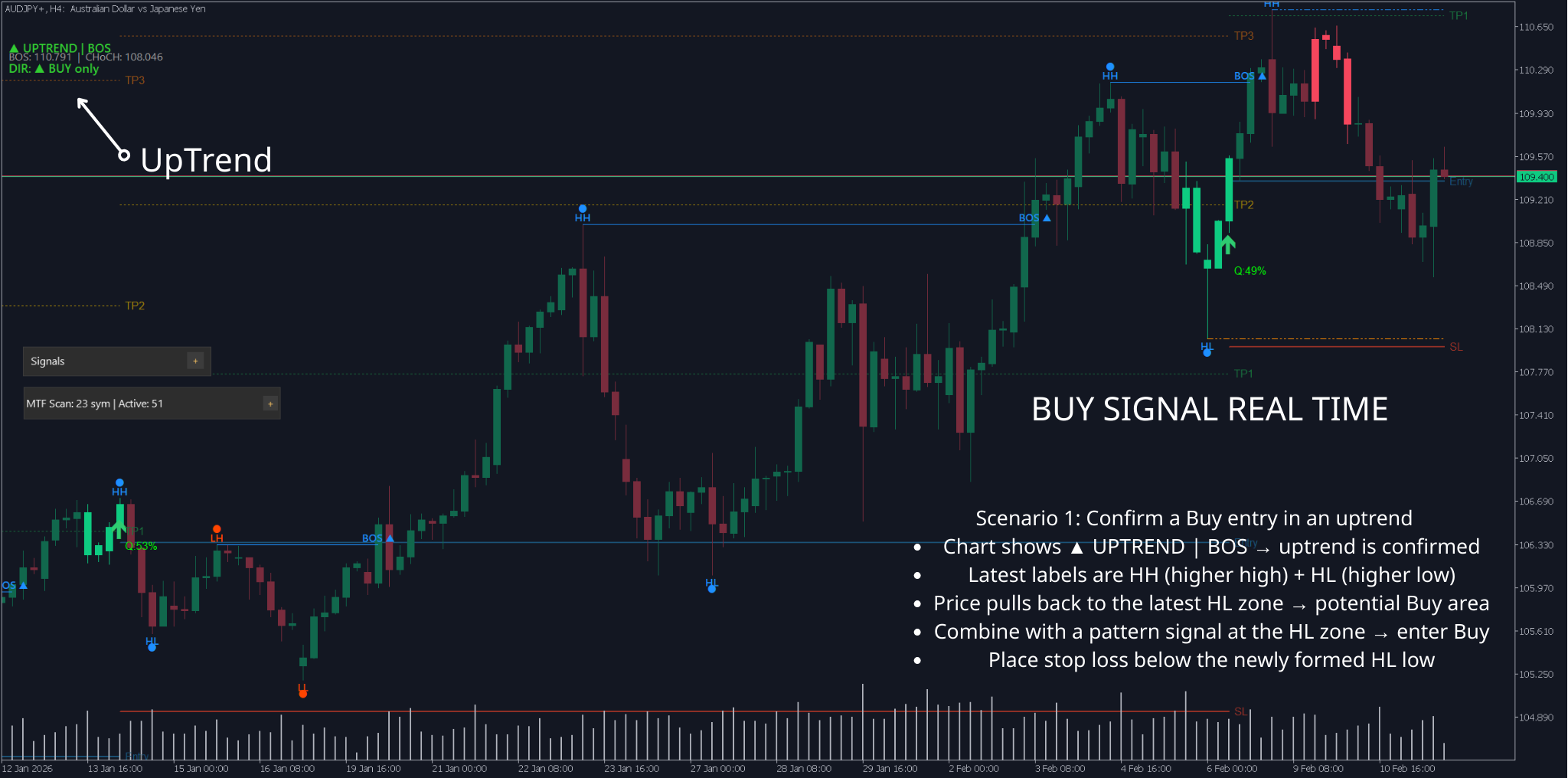 Chart shows ▲ UPTREND | BOS → uptrend is confirmed