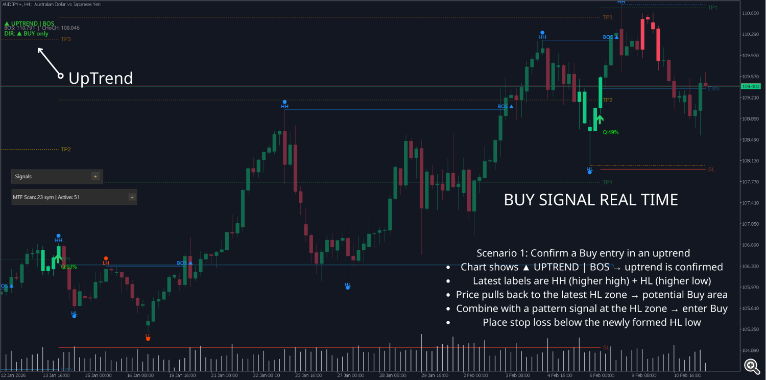 Avoid trading against structure: If Market Structure shows UPTREND + BOS ▲ → prioritize Buy, reduce Sell trades.
