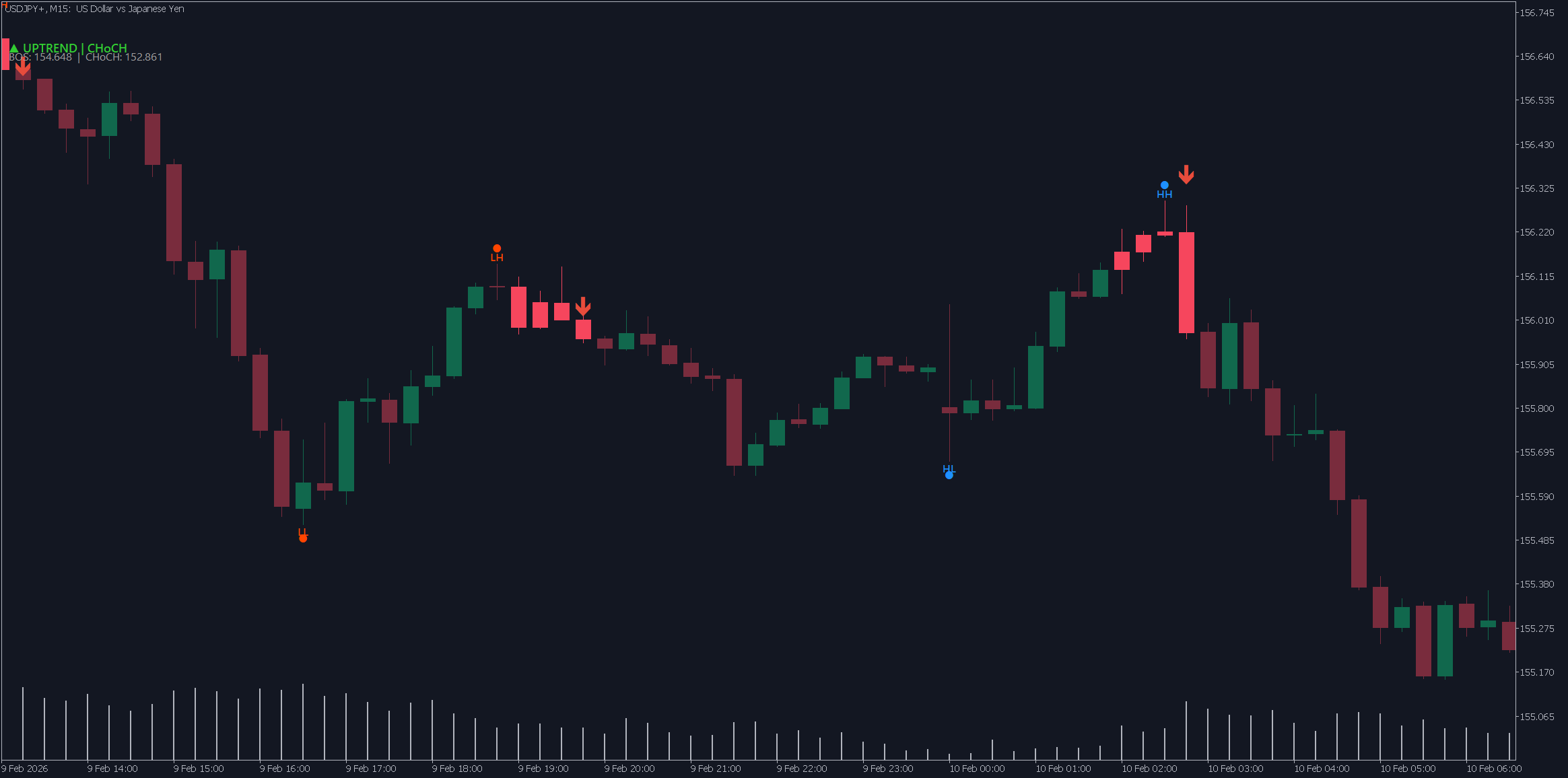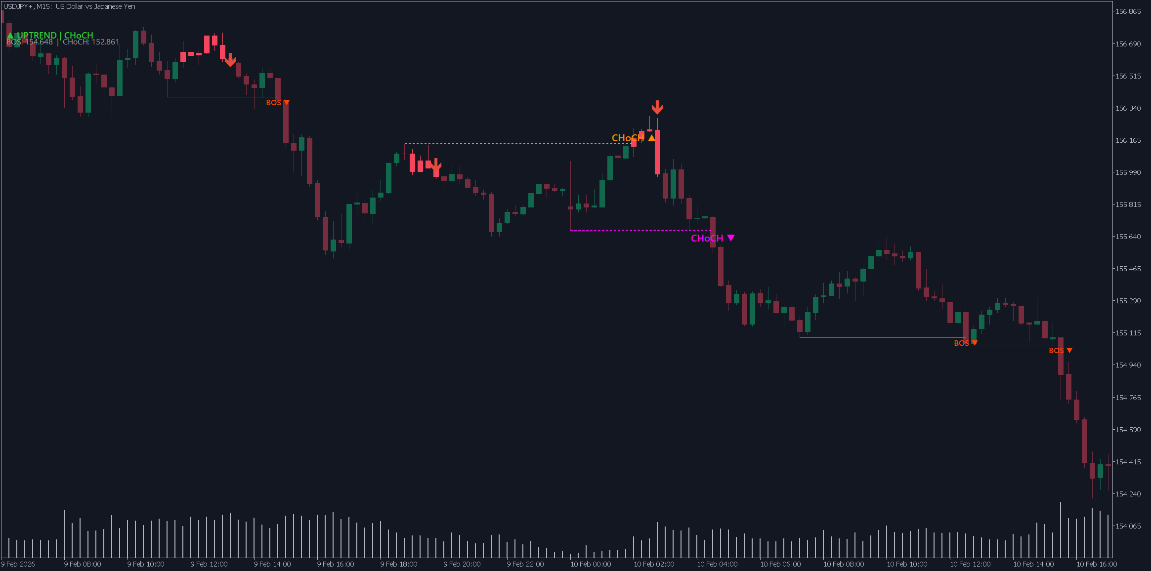 | CHoCH ▲ | Dark orange | Potential reversal from downtrend to uptrend |