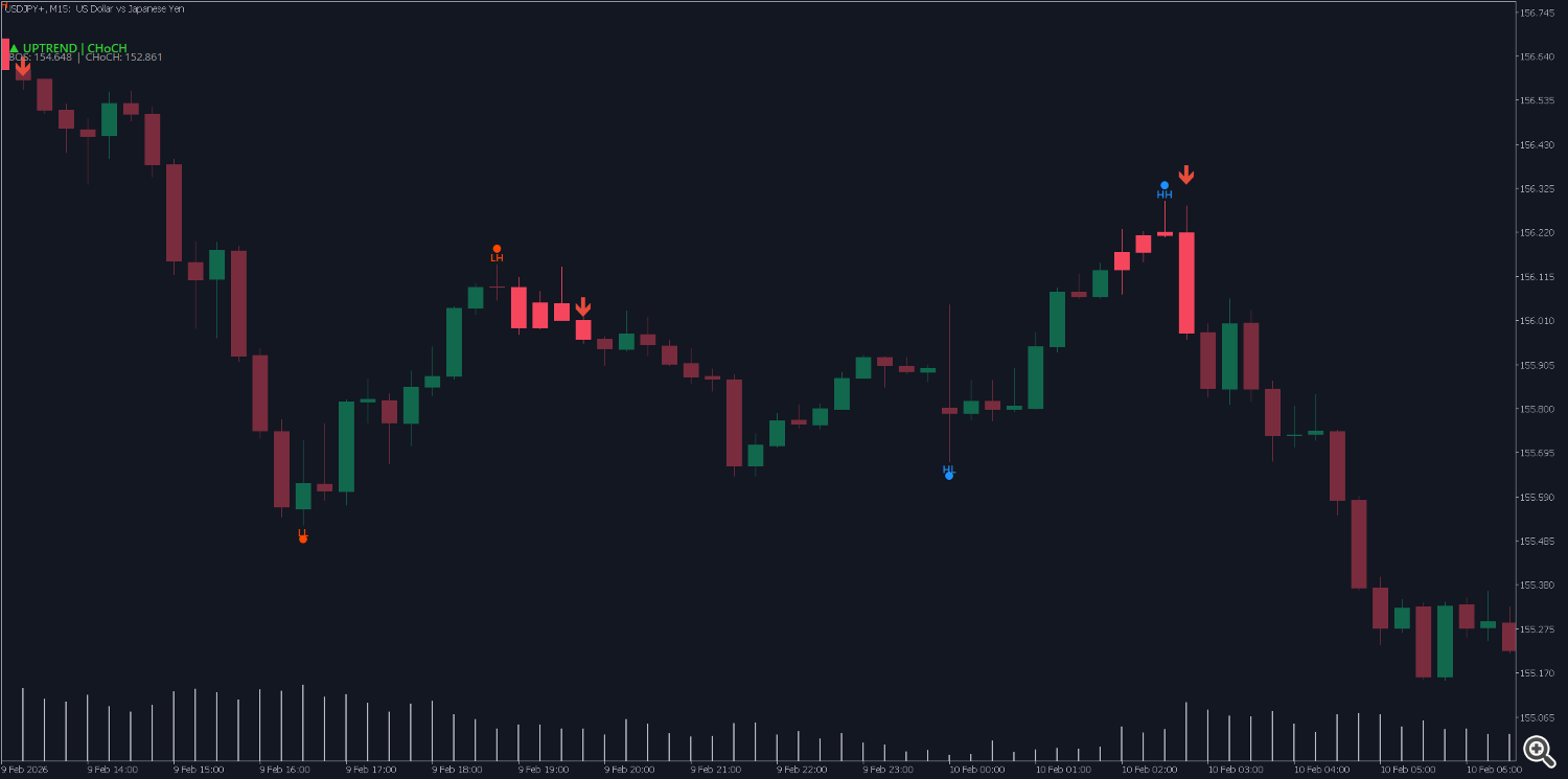 Real example: In an uptrend, price breaks below the latest low. If CHoCH Confirm = 2, the indicator waits for one more candle close below that low, then prints “CHoCH ▼” (potential bearish reversal).
