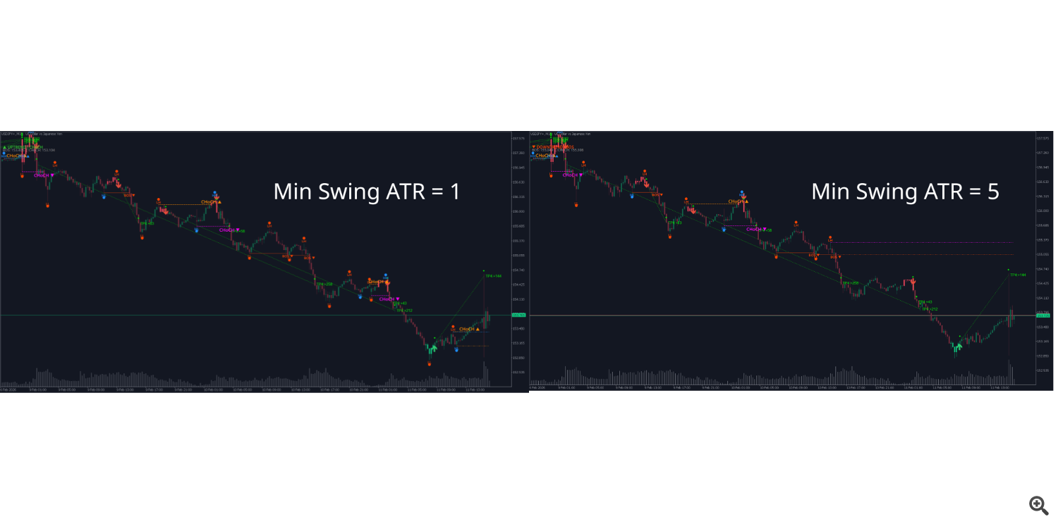 Meaning: The minimum distance between adjacent swing high and swing low must be at least Min Swing ATR × ATR to be considered a valid swing. If set to 0 , the indicator automatically calculates a suitable threshold.