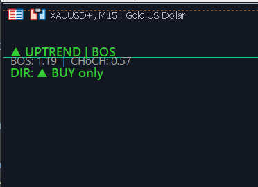 When Trade Direction is enabled (Custom or Follow Structure Trend), you'll see a small text line in the top-left corner of the chart, below the Market Structure label. This line shows which direction the system is allowing.