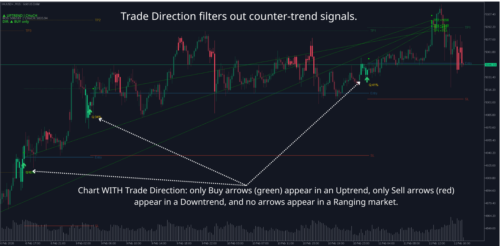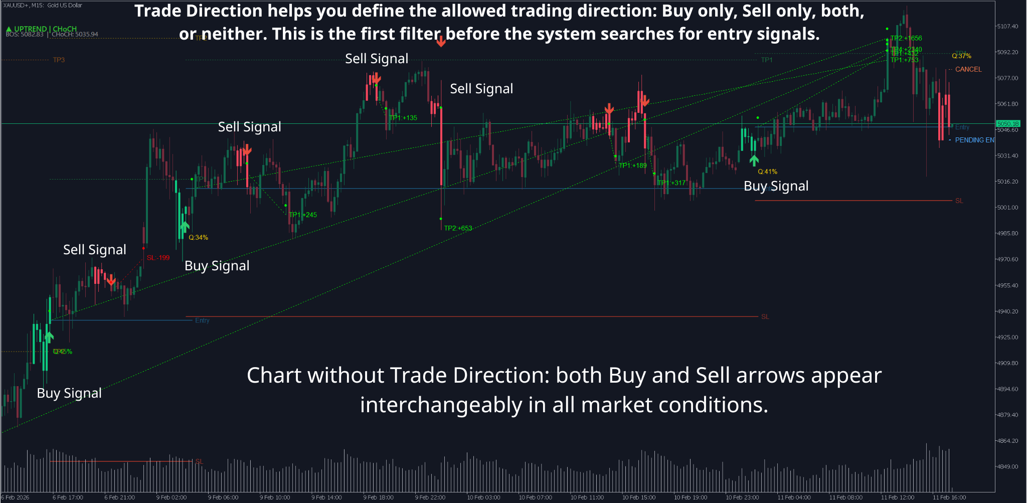 Market is trending up → Trade Direction allows only Buy → system only displays buy signals