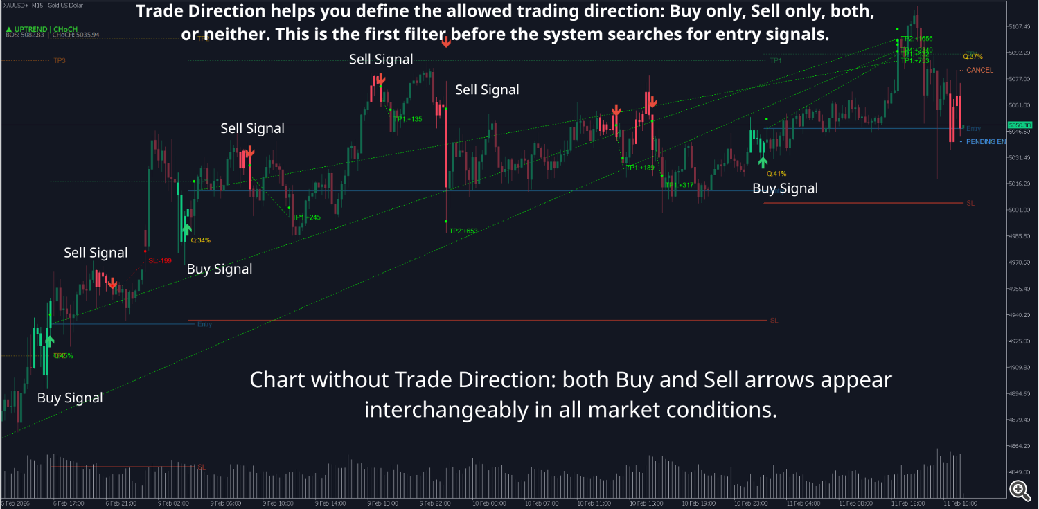 When Trade Direction blocks a direction, you'll miss some counter-trend signals that could have been profitable. This is an intentional trade-off: