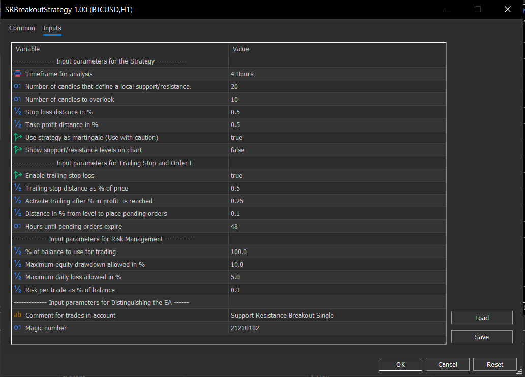 - Stop Order Distance: This distance in terms of percentage of the price will be used for placing orders above/below the support and resistance levels.
