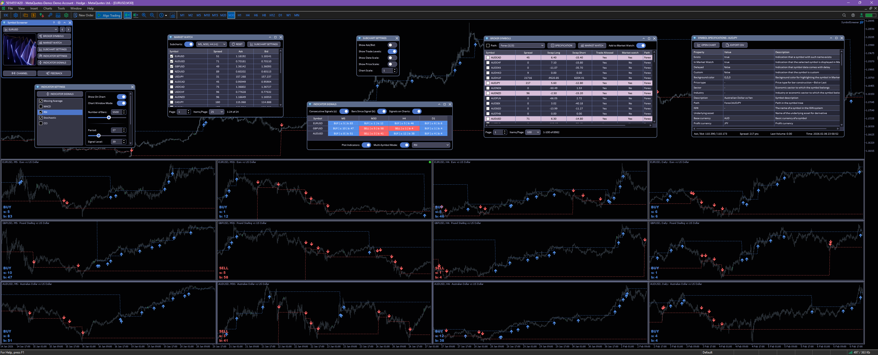 All of them work simultaneously: in single-symbol mode (Single Symbol) — table rows represent indicators and columns represent timeframes. In multi-symbol mode (Multi-Symbol) — rows become symbols, and you see the signals of the selected indicator across all tracked instruments.